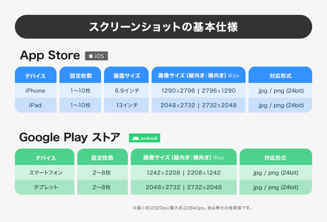 まずは、改めて各ストアのスクリーンショットの仕様や要件をおさらいしておきましょう。