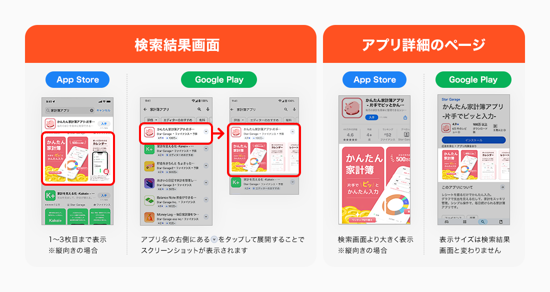 ストアによってスクリーンショットの最大設定枚数やサイズが異なるため、要件を確認してから作成に取り組んでください。