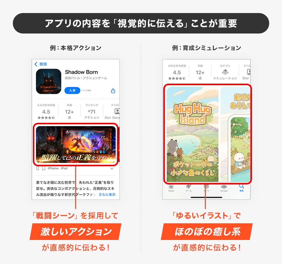 また、事前にイメージ等を伝えることによって、ユーザーの期待値とも乖離が生まれにくくなるため、ダウンロードの後の離脱を防ぐこともできるのです。