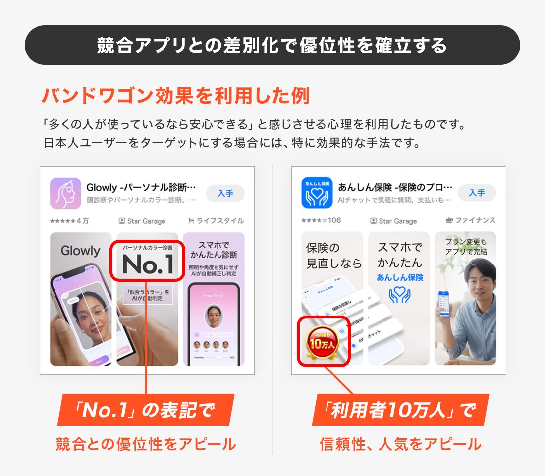 スクリーンショットを通じて、競合アプリとの違いや優位性を強調できます。