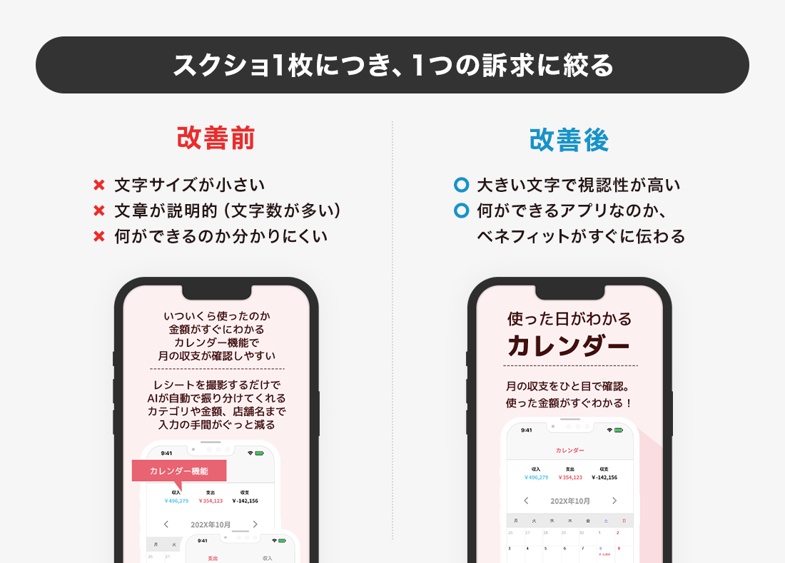スクリーンショットでは、ユーザーに伝えたい訴求を明確にすることが非常に重要です。