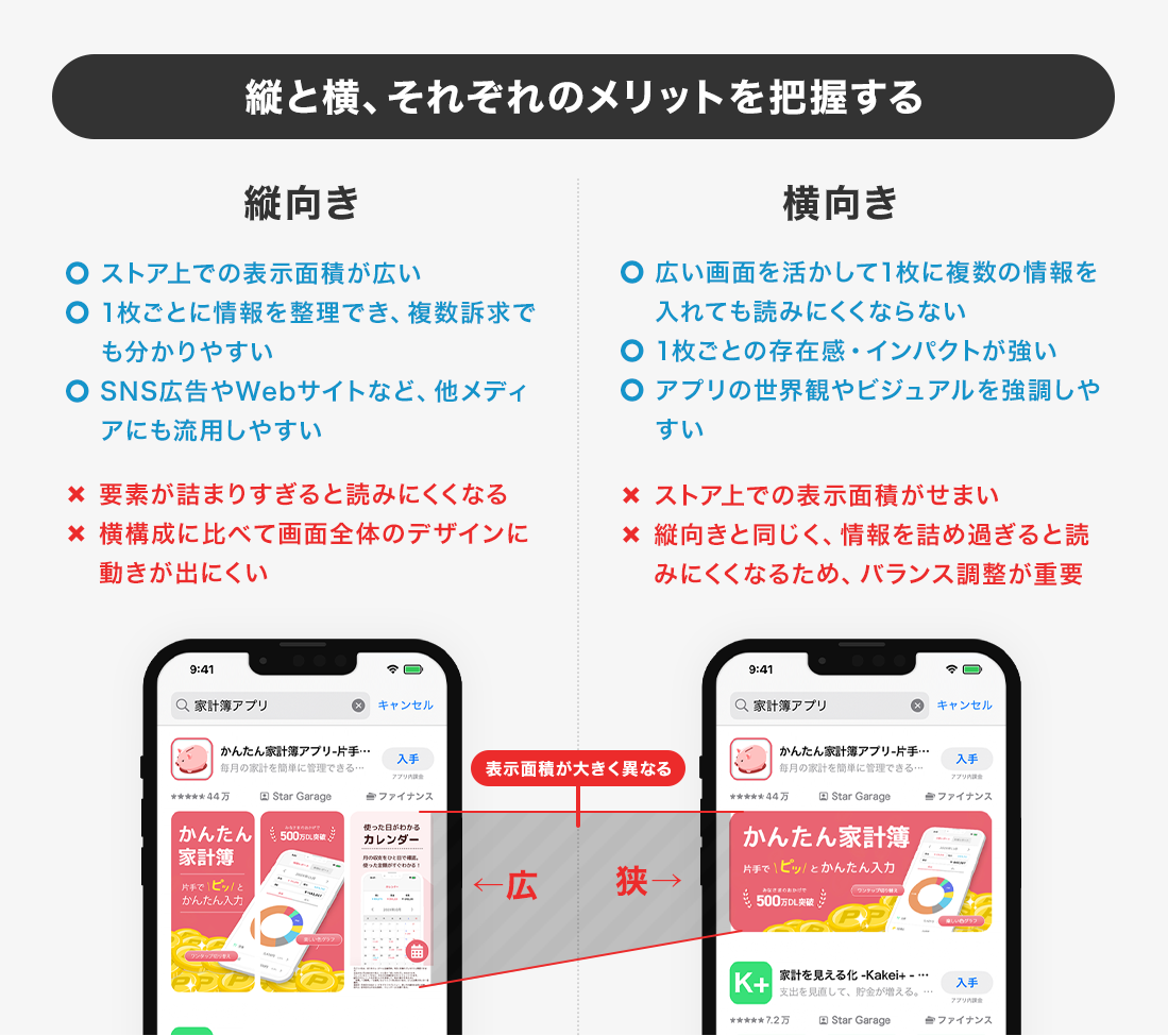 スクリーンショットの向きの違いはダウンロード率に大きく影響するため、十分に吟味して選択してください。