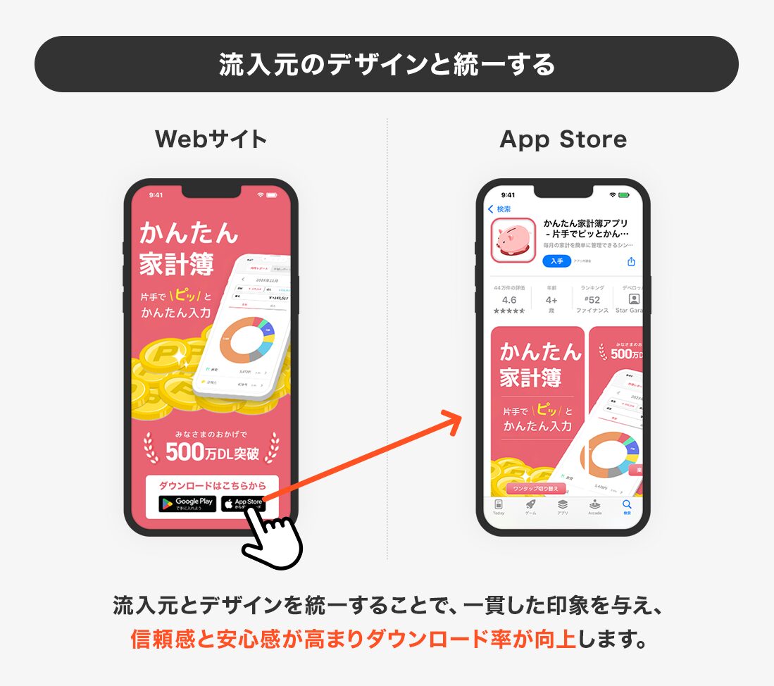 または特定のWEBサイトからストアに訪問するユーザーが多い場合は、そのWEBサイトで訴求している内容や雰囲気とスクリーンショットを合わせることでスムーズにダウンロードを促すことができます。