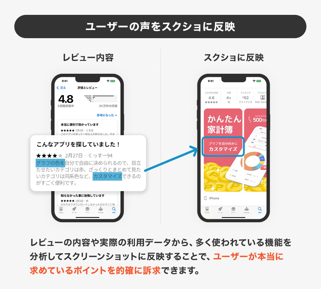 Point4.のダウンロード経路とは別に、ユーザーレビューなどを参考にスクリーンショットの訴求を決めることも非常に効果的です。