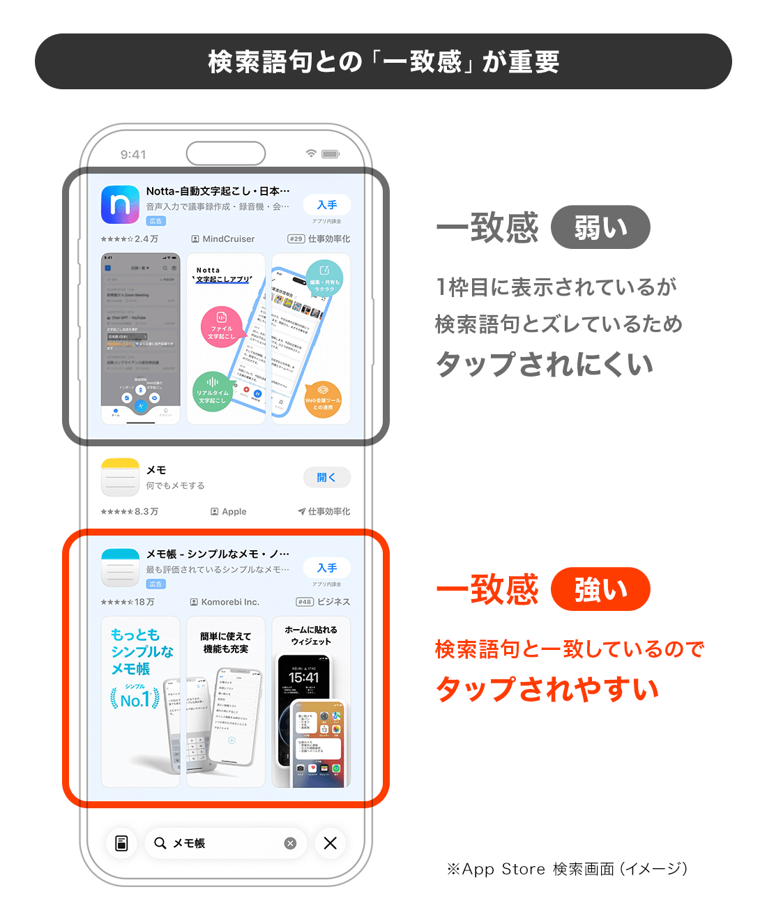 たとえば「メモ」と検索しているユーザーに対して、ひと目でメモアプリだと伝わるアプリと、そう見えにくいアプリでは、タップされやすさは変わります。