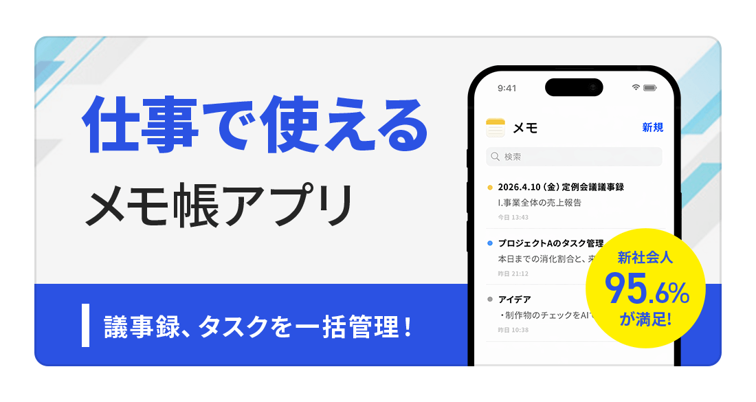スクリーンショットは、「仕事のメモを整理しやすい」「議事録やタスクもまとめて管理できる」といった、業務での使いやすさを訴求します。